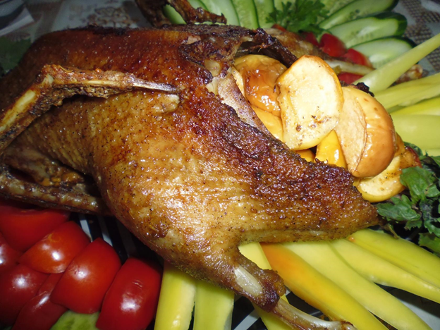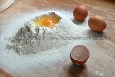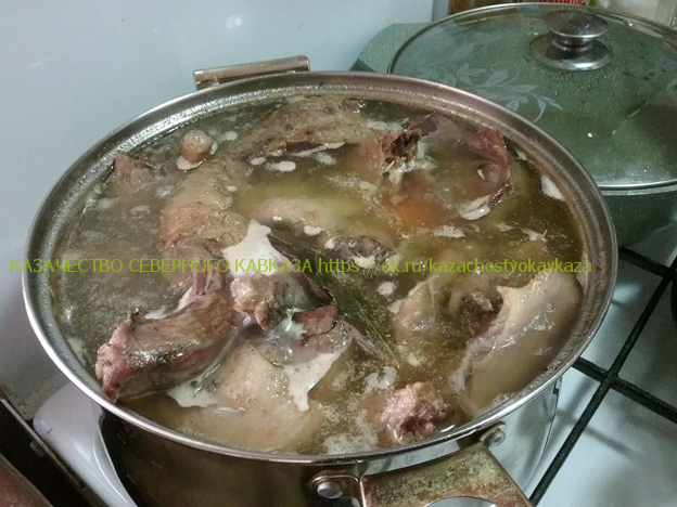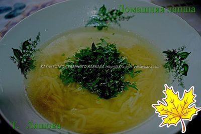 "Осенью, когда наступали первые морозы, казаки начинали готовиться к зиме: забивали скот, свиней, баранов, кроликов и, конечно, птицу. Птицы держали много, сами сажали квочек, разводили кур, уток, индоуток ,гусей, индюков, а уже позже - цесарок, фазанов, перепелок. Я помню, у нас дома столько было кур, что мы счету не знали, сами садились , выводили цыплят. Это не считая тех, которых мама сажала. Смотришь, откуда-нибудь из-под сожка выходит с цыплятами квочка. Чаще всего терские казачки готовили из птицы. Куры шли на поминальную лапшу, отварное мясо курятину ставили на поминальный стол. Готовили казачки и «борщ на петушке», и все супы скоромные часто были приготовлены на курятине. Уток после забоя солили в баллонах и делали тушёнку. Гусей и индюков сразу всех не забивали, рубили по надобности. Терская казачка Наталья Куценко вспоминает: «Мы петухов и старых кур по одной рубили на еду, пока не было холодильников к выходным, обычно сначала варили первое, а потом готовили из мяса второе. Холодильник мы купили раньше телевизора, причем сразу большой "Орск-2". Так что мясные блюда у нас были всегда, но в будни, мама варила первое и второе из полкурицы, а по выходным и праздникам из целой. Для меня и сейчас главное мясо- это птица». Мы рано стали держать индоуток, вот из них делали тушенку, забивали несколько штук, нарезали на кусочки, добавляли кулинарный жир тушили в нём, если было мало утиного и куриного жира, тушили в толстостенной алюминиевой кастрюле с приоткрытой крышкой, когда мясо отделялось от костей солили, добавляли перец горошком и лавровый лист, раскладывали по банкам 700-соткам и закатывали, потом летом из этой тушенки готовили разные блюда. Надо сказать как забивали птицу. Птице топором отрубали голову. Казачки сами проделывали эту процедуру. В то время как наши соседи чеченцы птицу режут ножом, голову птицы клали на восток и режут ножом. Казачки птицу помещали в кипяток, несколько раз опускали, далее удаляли перья, пеньки, потом птицу смолят, далее хорошо моют тряпочками в нескольких водах ,делают надрез внизу и через надрез удаляют внутренности, все хорошо моют, надо не забыть удалить зоб. Хорошо помыть и тушки готовы. Куриная лапша Очень вкусное, популярное блюдо в казачьих семьях. Это обрядовое блюдо. Которое подают на помин, да и так очень часто готовят. Домашняя лапша Для вкусного бульона курицу кладем в ледяную воду, доводим до кипения, уменьшаем огонь, снимаем пену. Наши бабушки еще и протирали стенки кастрюли чистой белой тряпочкой. Готовим курицу при едва видимом кипении, сильное кипение делает бульон мутным. Добавляем луковицу в шелухе и без шелухи, эти овощи придадут бульону золотистый оттенок. Замешиваем тесто на лапшу. Терские казачки замешивали тесто на лапшу на одних яйцах. Муку берем белую, мелкого помола, просеиваем. Замешиваем крутое тесто, оно должно полежать под теплой миской, сверху еще – полотенце. Позже раскатываем тесто в тонкие круги, подсушиваем их, сворачиваем в трубочку и нарезаем на полоски острым ножом. Лапшу надо немножко отряхнуть от муки и разложить для просушивания на бумаге или на полотенце. Казаки любили лапшу на чистом курином бульоне, без картошки и зажарки. Разделываем готовую курицу на кусочки. Лапшу просто опускаем в кипящий бульон, солим. Она варится быстро, время зависит от толщины нарезки, следит
